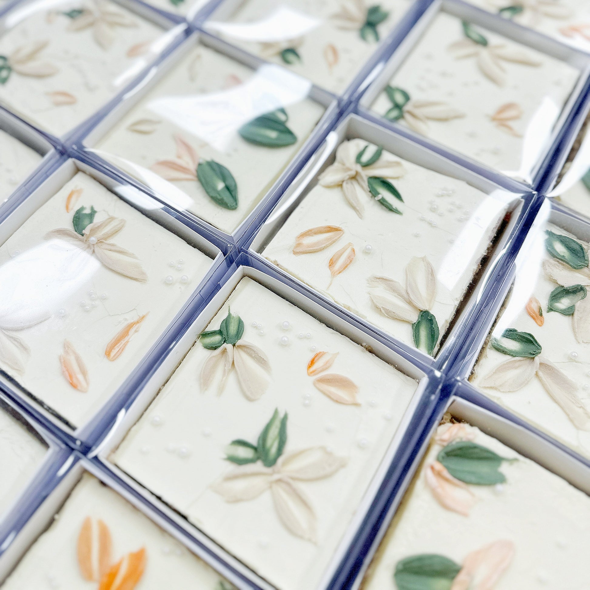 Square cut sheet cakes, frosted on top with buttercream, according to selected color palette. Floral design (palette knife application) included. Individually boxed with ribbons. Please messages us for color customization options / details.