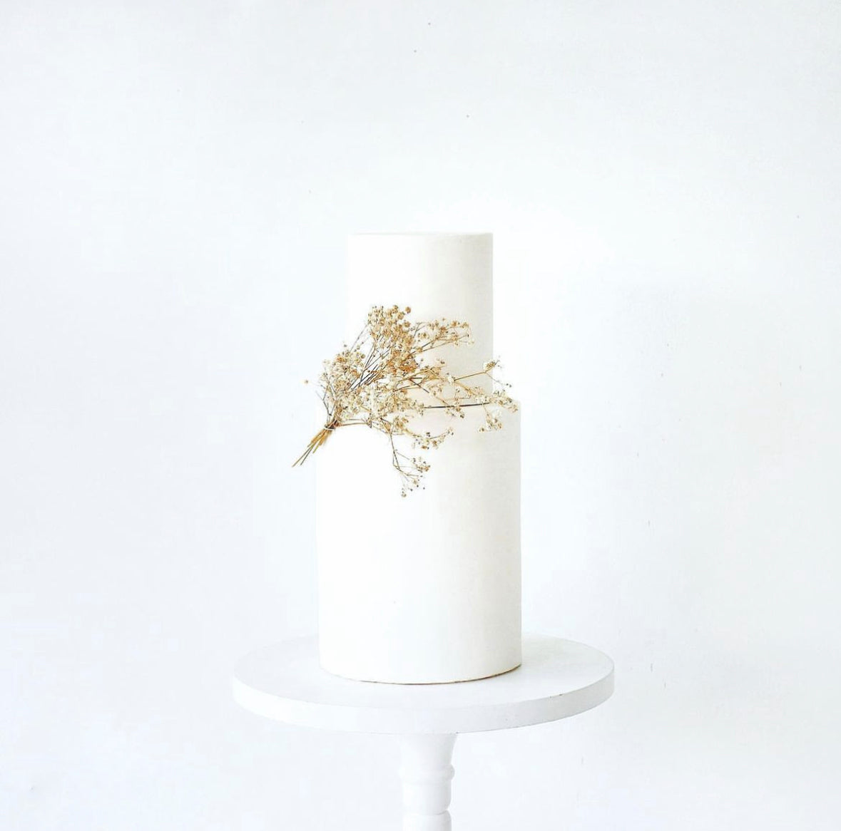 Erie is a two tier minimalist fondant cake with dried gypsophilia as accent. Bottom tier edible only.