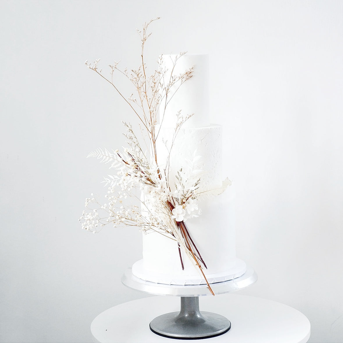 Ira is a three tier bottom edible, fondant cake with textured finish adorned with dried flowers foliage in neutral tones.