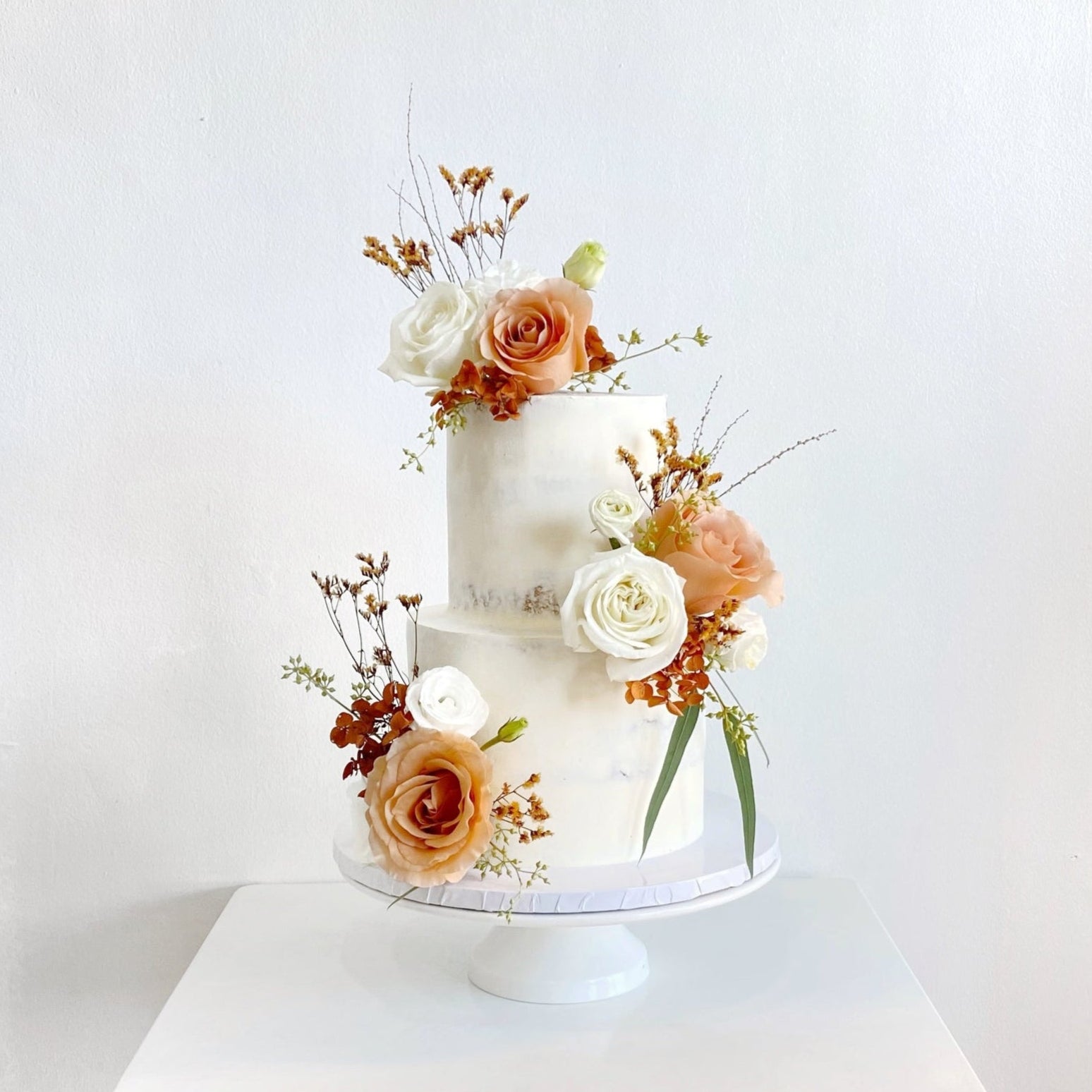 Isa is a two tier all edible semi-naked cake with autumn themed florals and foliage.