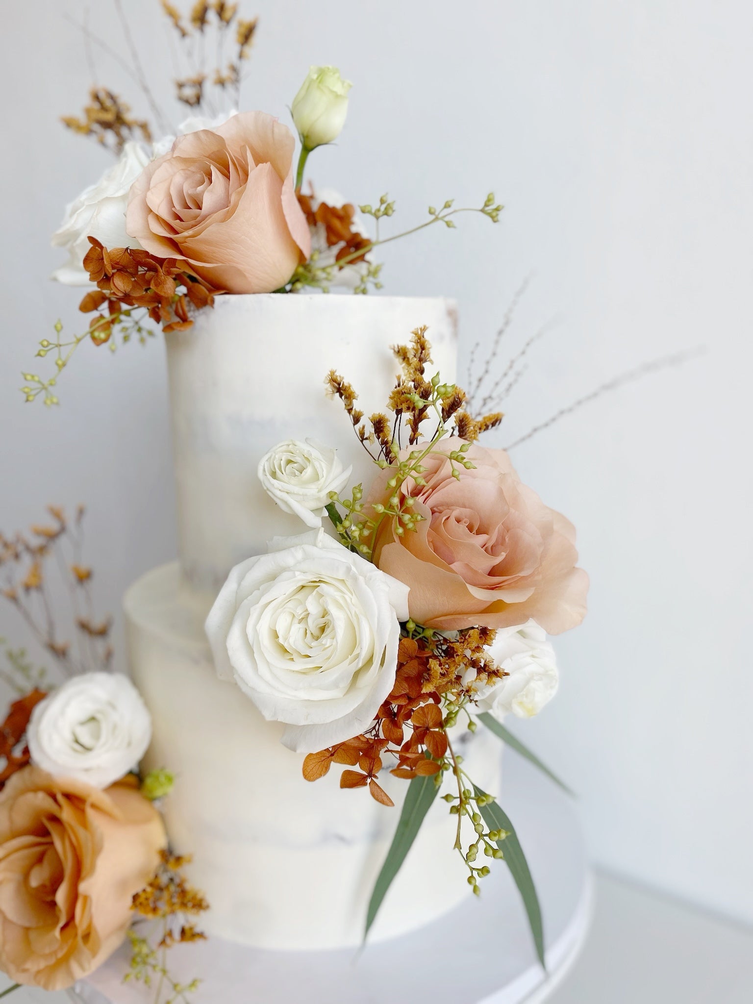 Cake Design: White buttercream / ganache semi-naked finish with fresh and dried florals and foliage. Some elements, decor or accents may not be available at the time of event. We may make adjustments as we see fit but the entire color palette or arrangement will still be followed.