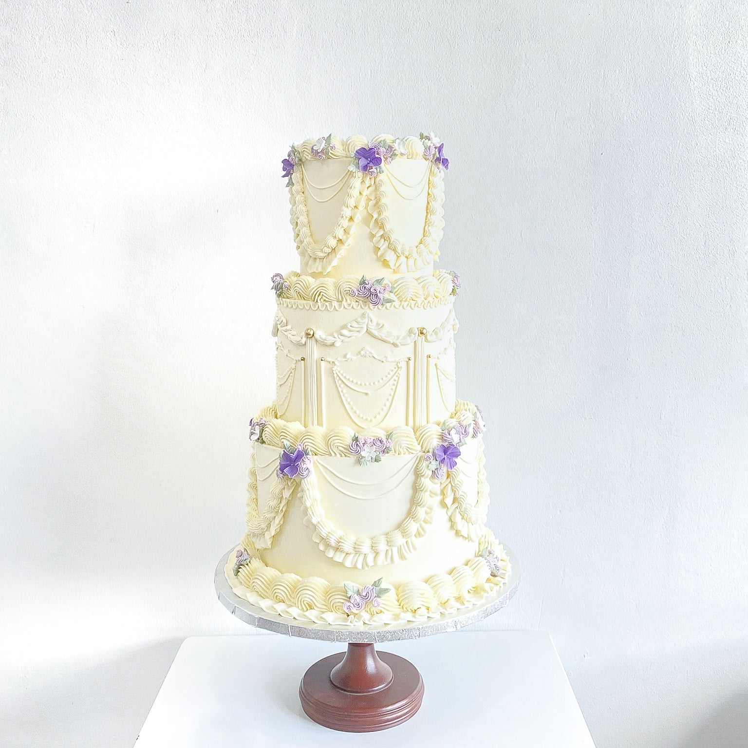 Cake Design: Buttercream / ganache cake finish with cream vintage piping and fondant design, minimal blossoms or florets in chosen color palette. Add-on designs or details may be charged at cost. Please email us for additional customization requirements.