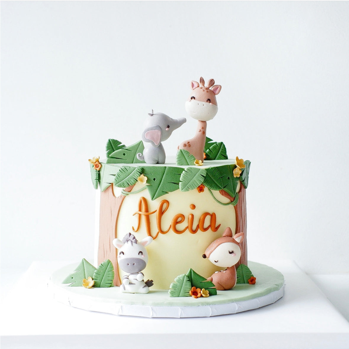 This fondant cake features several safari-themed animal toppers with celebrant's name in center in aesthetic font style.
