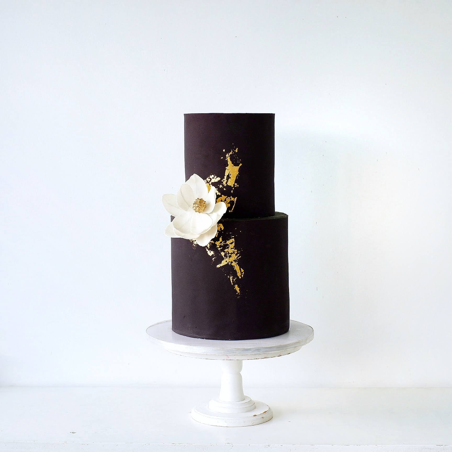 Venus is a two tier bottom edible, fondant cake adorned with minimal sugarflower and edible 24-karat gold leaf.